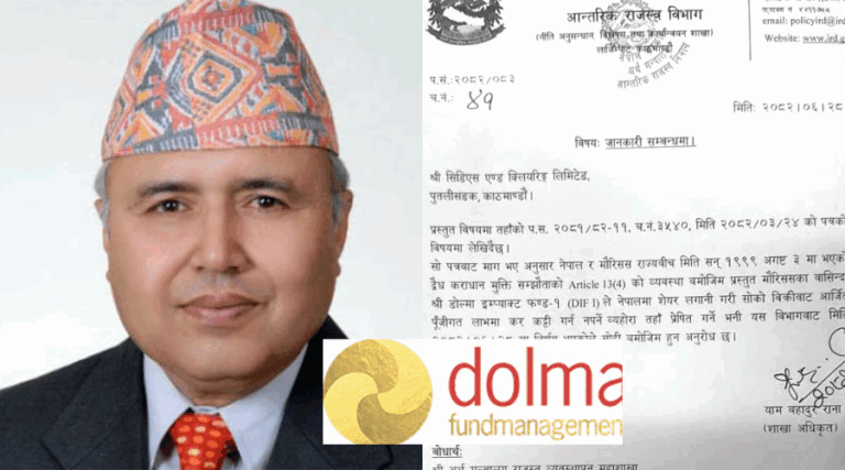 विभागका शाखा अधिकृत यामबहादुर रानाद्वारा श्री सीडीएस एन्ड क्लियरिङ लिमिटेडको नाममा निर्णय भएकै दिन पठाइएको पत्रमा भनिएको छ– ‘तपाईंको पत्रबाट माग भएअनुसार नेपाल–मारिसस राज्यबीच मिति सन् १९९९ अगष्ट ३ मा भएको द्वैध कराधान मुक्ति सम्झौताको आर्टिकल १३(४) को व्यवस्थाबमोजिम प्रस्तुत मौरिससका बासिन्दा श्री डोल्मा इम्प्याक्ट फन्ड १ ले नेपालमा सेयर लगानी गरी सोको बिक्रीबाट आर्जित पुँजीगत लाभमा कर कट्टी गर्न नपर्ने व्यहोरा तहाँ प्रेषित गर्ने भनी यस विभागबाट मिति २०८२ ।६।२८ मा निर्णय भएकाले सोहीबमोजिम हुन अनुरोध छ ।’