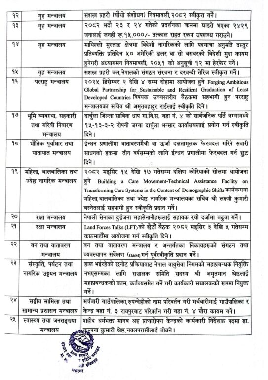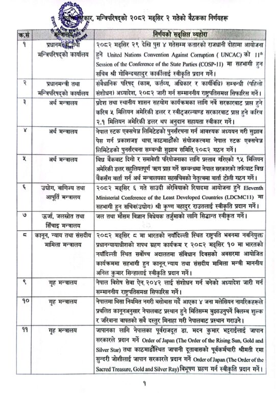 सरकारले मन्त्रिपरिषद् बैठकका निर्णय सार्वजनिक गरेको छ । बुधबार सरकारका प्रवक्ता एवम् सञ्चार तथा सूचना प्रविधिमन्त्री जगदीश खरेलले पत्रकार सम्मेलन गर्दै मंगलबार बसेको मन्त्रिपरिषद् बैठकका निर्णय सार्वजनिक गरेका हुन् ।