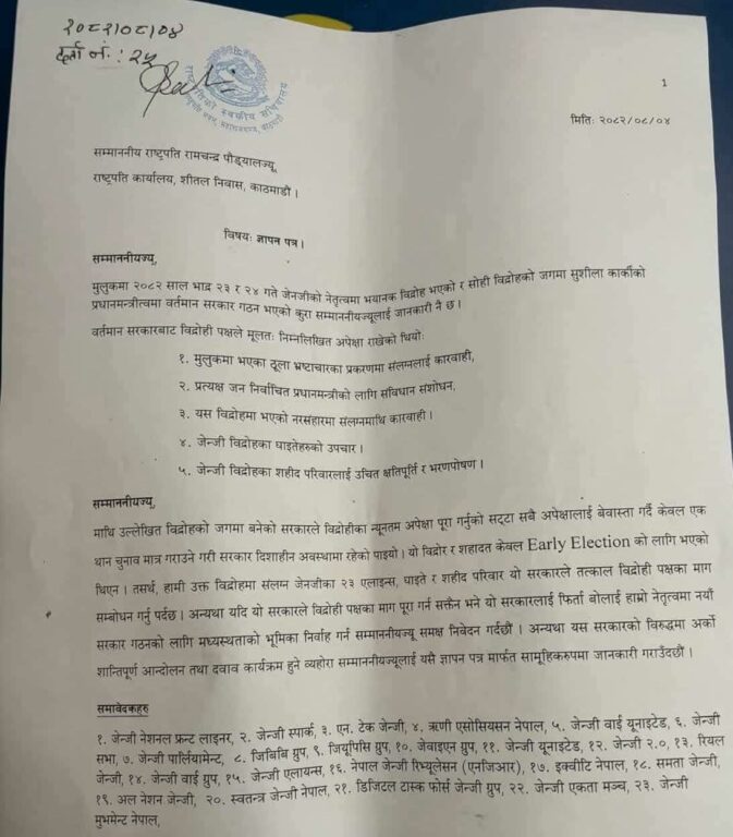 जेनजी आन्दोलनका मागहरू कार्यान्वयन नभएको भन्दै प्रधानमन्त्री सुशीला कार्की नेतृत्वको सरकारलाई फिर्ता बोलाउन जेनजी समूहले राष्ट्रपति रामचन्द्र पौडेललाई मागसहित ज्ञापनपत्र बुझाएका छन्।