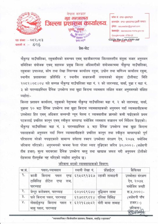 जिल्ला प्रशासन कार्यालय रसुवाको नेतृत्वमा नौकुण्ड गाउँपालिका–२ का लारच्याङ, यार्सा र युव्रा क्षेत्रका करिब १० वटा दैनिक उपभोग्य तथा खुद्रा किराना पसलहरूमा गरिएको अनुगमनका क्रममा अधिकांश व्यवसायीमा उपभोक्ता हित तथा अधिकारसम्बन्धी चेतना न्यून रहेको पाइयो। प्रचलित कानुन तथा स्वीकृत मापदण्डअनुसार व्यवसाय सञ्चालन गर्न पहिलो पटक चेतावनीसहित निर्देशन दिइएको अनुगमन टोलीले जनाएको छ।