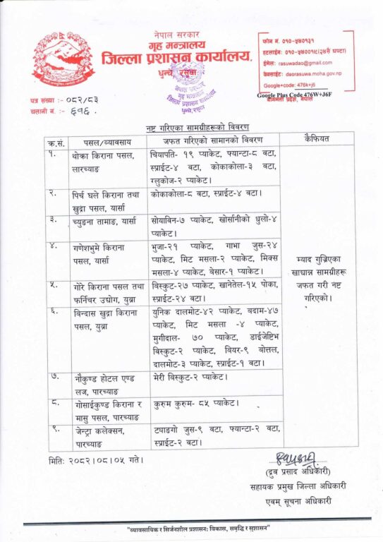 दक्षिणी रसुवाको नौकुण्ड क्षेत्रमा सञ्चालन गरिएको जिल्ला स्तरीय संयुक्त बजार अनुगमनका क्रममा फेला परेका म्याद गुज्रिएका उपभोग्य वस्तुहरू नष्ट गरिएको छ।