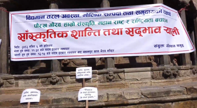 ललितपुरको पाटन दरबार स्क्वायर परिसरमा शनिबार मौलिक सम्पदा तथा समुदायको संरक्षणका उद्देश्यले सांस्कृतिक शान्ति तथा सद्भाव र्याली सम्पन्न भएको छ।