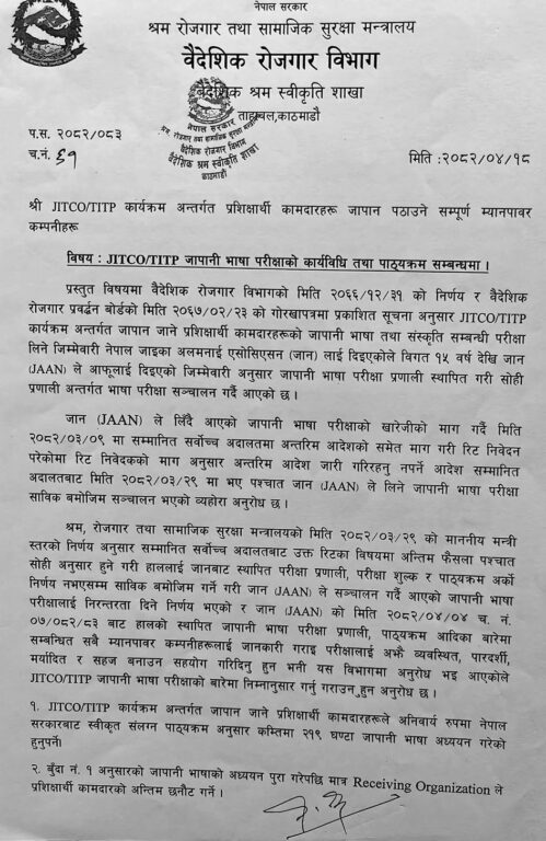 २०८२ साल असार २९ गतेको मन्त्रीस्तरीय बैठकको निर्णयअनुसार वैदेशिक रोजगार व्यवस्थापन शाखाले नेपाल जाइका अल्मनाई एसोसिएसन (जान) लाई पत्र लेखेर सर्वोच्च अदालतको फैसला नआउँदासम्म जापानी भाषा परीक्षा निरन्तर सञ्चालन गर्न निर्देशन दिएको थियो । उक्त पत्रमा सर्वोच्च अदालतमा दर्ता भएको रिट निवेदनको अन्तिम फैसला नहुँदासम्म परीक्षा र प्रक्रिया साविककै रूपमा चलाउनु पर्ने स्पष्ट उल्लेख छ । तर, मन्त्रालयमा श्रममन्त्री नहुनु र प्रधानमन्त्रीको प्रत्यक्ष निगरानीमा रहनुको फाइदा उठाएर सर्वोच्चको मुद्दालाई बेवास्ता गर्दै खारेजीको निर्णय लिने प्रयास भएको बताइन्छ । श्रम मन्त्रालयका अधिकारीहरूले प्रधानमन्त्रीलाई पनि गलत जानकारी दिने र ठूलो आर्थिक लाभका लागि यो चलखेल चलाइरहेको स्रोतको भनाइ छ ।