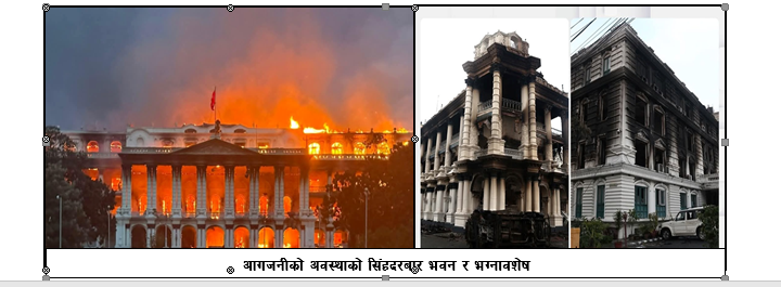 आखिरमा सिंहदरबारलाई आफ्नो अस्तित्वको अन्तिम क्षणमा एक घुट्का पानी पिलाउने पनि कोही भएन र रातभर जलिरह्यो । कुरो २०८२ साल भाद्र २४ गते मङ्गलबारको हो । भाद्र २३ गतेको जेनजीको आन्दोलनको दोस्रो परिदृश्यमा नयाँ सांसद भवननिरको भीषण संघर्षमा १९ जना होनहार विद्यार्थीहरूको निर्मम हत्या र अति महत्वपूर्ण अमूर्त तथा मूर्त सांस्कृतिक सम्पदा, सरकारी तथा निजी भवनहरूको आगजनी भयो । यी सबै क्षतिहरूमध्ये पाटनका बुङ्द्यः (रातो मत्सेन्द्रनाथ) को पाङ्ग्राहरू, सिंहदरबार प्रधानमन्त्रीको कार्यालयस्थित भवन र पशुपतिनाथ मन्दिर परिसरस्थित प्रहरी चौकी पनि हृदय विदारक र ऐतिहासिक रूपमा विध्वंशकारी आगजनीमा नष्ट भयो ।
