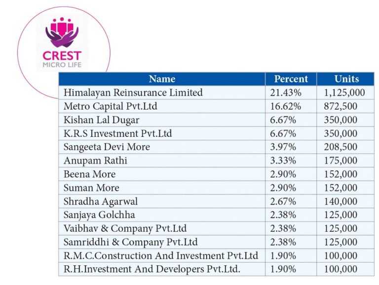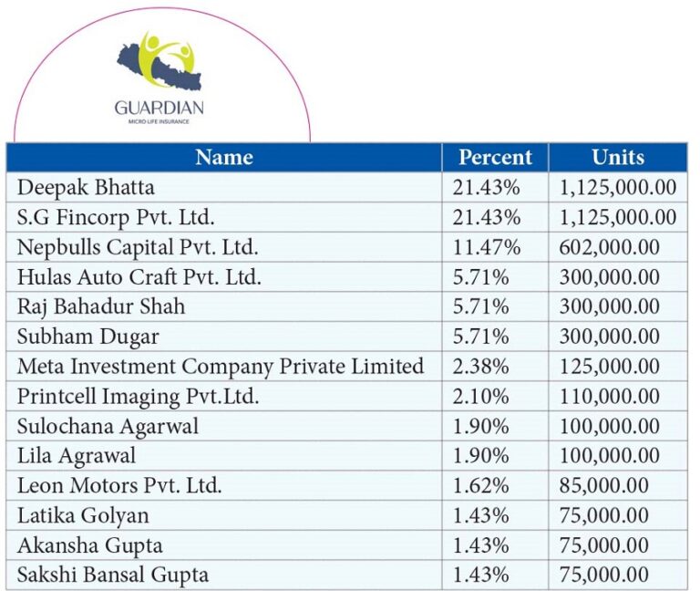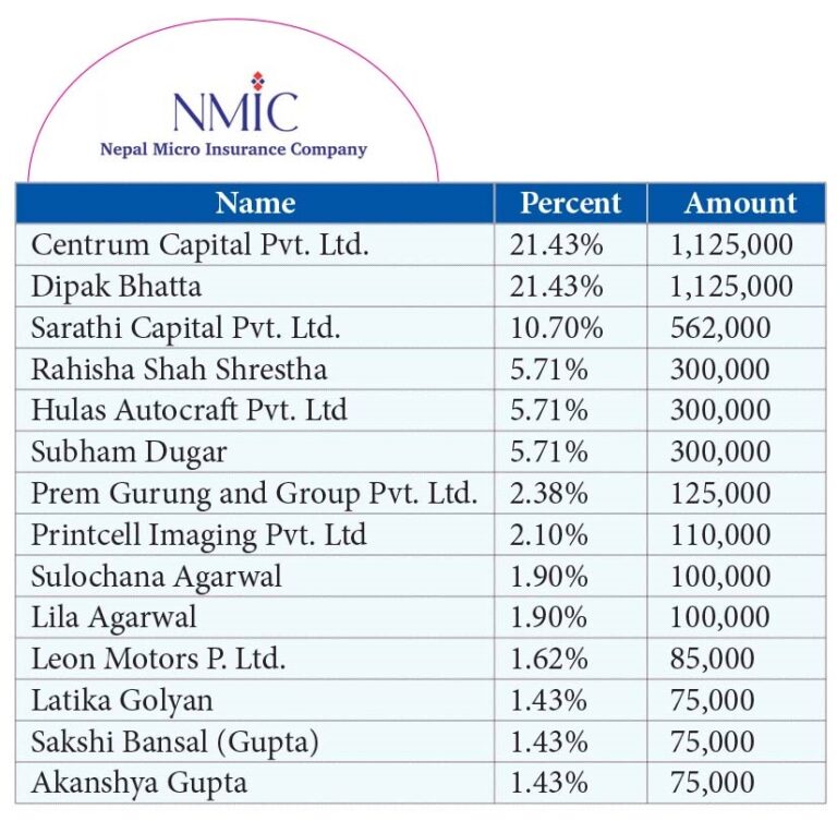 अनुमति पाएका सात कम्पनी गार्डियन, क्रेस्ट, लिबर्टी, नेपाल माइक्रो, प्रोटेक्टिभ, स्टार र ट्रस्ट माइक्रोमध्ये अधिकांशमा शंकर समूह, इन्फिनिटी होल्डिङ र उनीहरूसँग सम्बद्ध उद्योगी व्यवसायीको लगानी भेटिन्छ । गार्डियन माइक्रो लाइफ र नेपाल माइक्रो इन्स्योरेन्समा अग्रवाल परिवार, इन्फिनिटी होल्डिङ र तिनका नातेदारको ४० प्रतिशतभन्दा बढी लगानी छ । कानुनी रूपमा एक व्यक्तिलाई १५ प्रतिशतभन्दा बढी शेयर लिन रोक्का व्यवस्था हुँदाहुँदै नातेदार तथा नयाँ दर्ता कम्पनीमार्फत लगानी फैलाइएको देखिन्छ ।