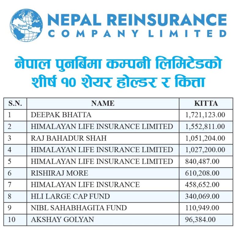 सरकारको ४४ प्रतिशत स्वामित्व रहेको नेपाल पुनर्बीमा कम्पनी भट्ट–अग्रवालको कब्जामा पुग्ने खतरामा छ । सो समूहको नेतृत्वमा रहेका व्यावसायिक घरानाले नेपाल पुनर्बीमाको करिब २५ प्रतिशत सेयर उठाइरहेका छन् । यीमध्ये हिमालयन लाइफ इन्स्योरेन्स प्रमुख ‘खरिदकर्ता’का रूपमा अघि आएको छ, जसले मात्रै ३५.७८ लाख कित्ता सेयर किनेको दस्तावेजले देखाउँछ । यो समूहको उद्देश्य नेपाल पुनर्बीमा कम्पनीमा सरकारको सेयर अंश घट्दै आफ्नो समूहको नियन्त्रणमा लैजाने र अन्ततः हिमालयन रिइन्स्योरेन्ससँग मर्जर, पूर्ण नियन्त्रण योजनासहितको रणनीति अगाडि बढाएको आरोप लगाइएको छ । यसका निम्ति सरकारी अधिकारीहरुले साथ दिँदै आएका छन्
