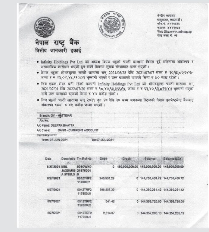 बैंक स्टेटमेन्ट अनुसार २०२१ जुन २७ देखि ३० सम्म ४ दिनमै जगदम्बा स्टिलले भट्टको व्यक्तिगत खातामा १५ करोड, १४ करोड (पहिलो चेक फिर्ता, भोलिपल्ट पुनः जम्मा) र १६ करोड गरेर ४५ करोड रुपियाँ जम्मा गरेको अनुसन्धानमा देखिएको छ । यस्तै शैलीमा थप ४० करोड रुपियाँ जम्मा भएको, तर केका लागि भुक्तानी भएको सम्पत्ति शुद्धीकरण विभागका स्रोत बताउँछन् । अझ गम्भीर कुरा—जगदम्बा स्टिलको लेखापरीक्षण प्रतिवेदनमा यी सबै लेनदेन छुटाइएका थिए । स्टेटमेन्ट लुकाइएको विषय राष्ट्र बैंकबाट दोहोरो परीक्षणपछि पत्ता लगाएको हो ।