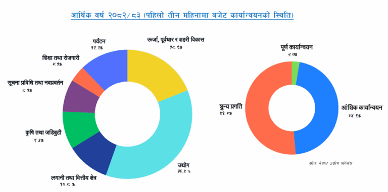 चालु आर्थिक वर्ष २०८२-८३ को पहिलो तीन महिनामा औद्योगिक तथा व्यावसायिक क्षेत्रसँग सम्बन्धित बजेटका कार्यक्रम कार्यान्वयन अत्यान्तै कमजोर देखिएको छ । नेपाल उद्योग परिसंघले मंगलबार ‘बजेट वाच’ प्रतिवेदन सार्वजनिक गर्दै पहिलो त्रैमासमा ७४ बुँदामध्ये ५१.४ प्रतिशतमा शून्य प्रगति, ४५.९ प्रतिशतमा आंशिक प्रगति र मात्र २.७ प्रतिशतमा पूर्ण कार्यान्वयन भएको तथ्य सार्वजनिक गरेको हो ।