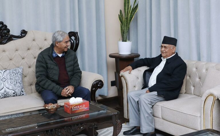 नेपाली काँग्रेसका सभापति शेरबहादुर देउवा र नेकपा (एमाले) का अध्यक्ष केपी शर्मा ओलीबीच भेटवार्ता भएको छ । देउवा निवास महाराजगञ्जमा शुक्रबार अपरान्ह भएको भेटवार्तामा वर्तमान समसामयिक राजनीतिक विषयमा छलफल जारी रहेको अध्यक्ष ओलीको सचिवालयले जनाएको छ ।