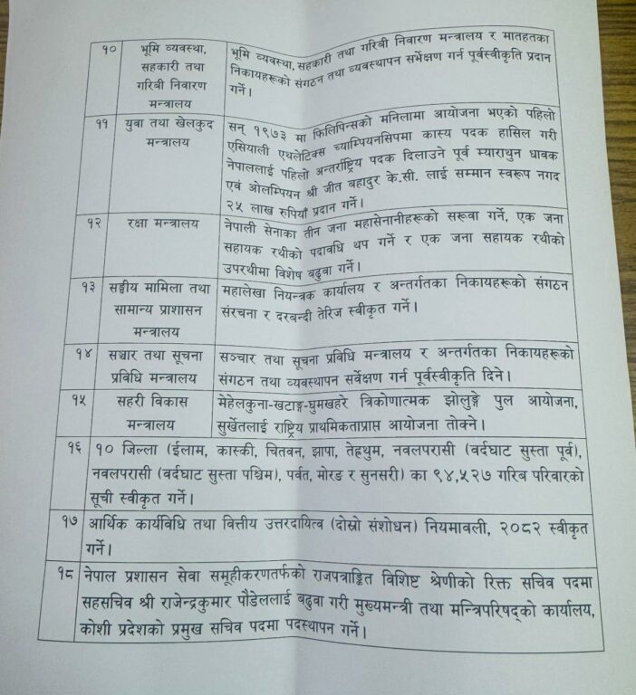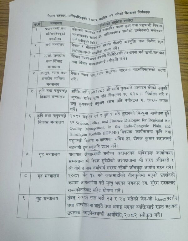 सरकारले सोमबार बसेको मन्त्रिपरिषद् बैठकका निर्णय सार्वजनिक गरेको छ । मङ्गलबार सरकारका प्रवक्ता एवम् सञ्चार तथा सूचना प्रविधिमन्त्री जगदीश खरेलले पत्रकार सम्मेलन गर्दै मन्त्रिपरिषद् बैठकका निर्णय सार्वजनिक गरेका हुन् ।