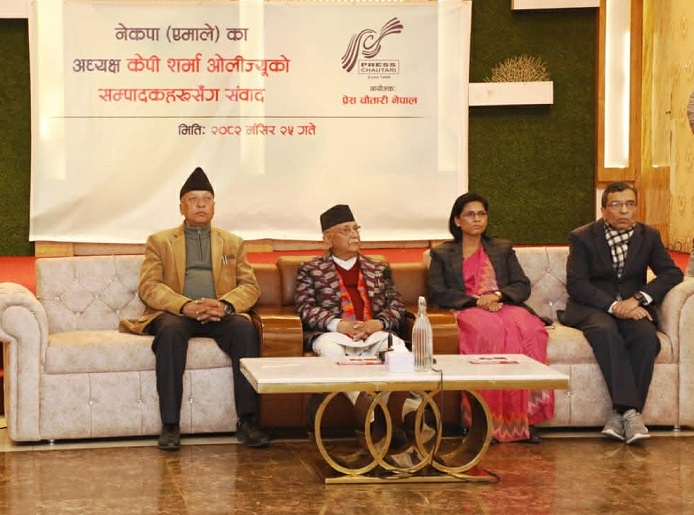 प्रेस चौतारी नेपालले बिहीबार काठमाडौंमा आयोजना गरेको सम्पादकहरूसँगको संवाद कार्यक्रममा बोल्दै अध्यक्ष ओलीले अहिलेको सरकार कसैले टपक्क टिपेर टाँसिदिएको सरकार भएको बताए । ‘यो फेद न टुप्पोको सरकार हो’, उनले भने ।