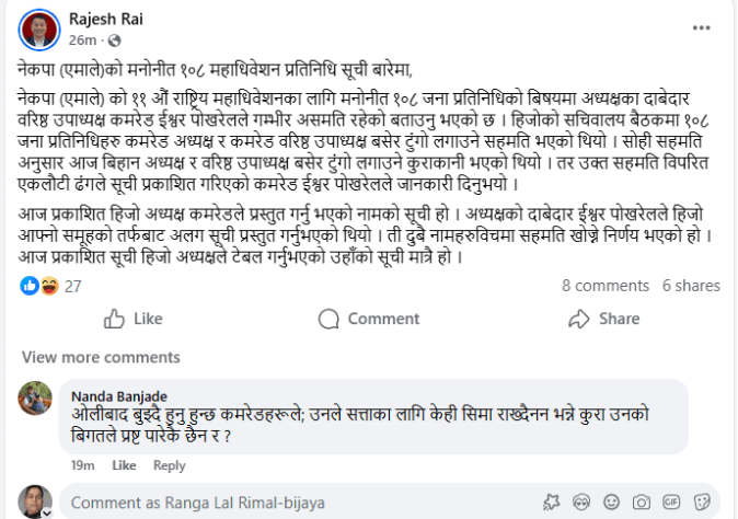 नेकपा (एमाले) अध्यक्ष केपी शर्मा ओली पक्षले सहमति विपरीत एकपक्षीय रूपमा प्रतिनिधि मनोनयन गरेको भन्दै वरिष्ठ उपाध्यक्ष ईश्वर पोखरेल समूहले आपत्ति जनाएको छ। शुक्रबारको सचिवालय बैठकमा ६०–४० को अनुपातमा प्रतिनिधि मनोनयन गर्ने सहमति भए पनि त्यसको पालना नभएको पोखरेल समूहको आरोप छ।