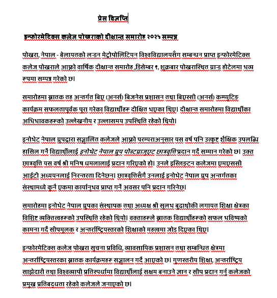 बेलायतको लन्डन मेट्रोपोलिटियन विश्वविद्यालयसँग सम्बन्धन प्राप्त इन्फोरमेटिक्स कलेज पोखराले आफ्नो वार्षिक दीक्षान्त समारोह २०२५ डिसेम्बर ९, शुक्रबार पोखरास्थित ग्रान्ड होटेलमा भव्य रूपमा सम्पन्न गरेको छ।