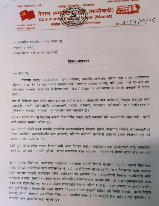 नेकपा माओवादीले राष्ट्रपति रामचन्द्र पौडेललाई बुधबार १३ बुँदे ज्ञापनपत्र बुझाउँदै कार्की नेतृत्वको अन्तरिम सरकार भंग गर्न माग गरेको हो । ज्ञापनपत्रमा जेनजी विद्रोहको भावना अनुरूप विशेष परिस्थितिमा अवलम्बन गरिने आवश्यकताको सिद्धान्तलाई प्रयोग गरी संवधिान संशोधन गर्न माग गरिएको छ।