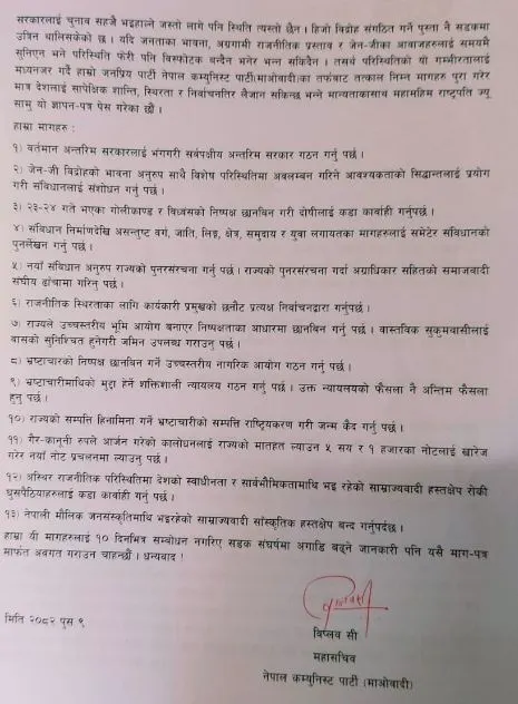 ‘यदि जनताका भावना, अग्रगामी राजनीतिक प्रस्ताव र जेनजीका आवाजहरूलाई समयमै सुनिएन भने परिस्थिति फेरी पनि विस्फोटक बन्दैन भनेर भन्न सकिँदैन । तसर्थ परिस्थितिको यो गम्भीरतालाई मध्यनजर गर्दै हाम्रो जनप्रिय पार्टी नेपाल कम्युनिस्ट पार्टी (माओवादी) का तर्फबाट तत्काल निम्न मागहरू पूरा गरेर मात्र देशलाई सापेक्षिक शान्ति, स्थिरता र निर्वाचनतिर लैजान सकिन्छ भन्ने मान्यताकासाथ महामहिम राष्ट्रपति ज्यू सामु यो ज्ञापन पत्र पेश गरेका छौं जारी ज्ञापनपत्रमामा भनिएको छ।’