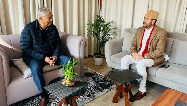 सञ्चारमन्त्री जगदीश खरेल र नेपाली कांग्रेसका सभापति शेरबहादुर देउवाबीच भेटवार्ता भएकाे छ । सरकारका प्रवक्तासमेत रहेका मन्त्री खरेलले बिहान नेपाली कांग्रेसका सभापति शेरबहादुर देउवालाई महाराजगञ्जस्थित निवासमा भेटेका हुन्।