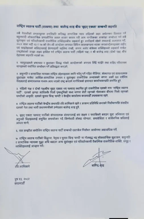 राष्ट्रिय स्वतन्त्र पार्टी (रास्वपा) का सभापति रवि लामिछाने र काठमाडौं महानगरपालिकाका मेयर बालेन शाहले एउटै दलमार्फत प्रतिनिधिसभा निर्वाचनमा प्रतिस्पर्धा गर्ने सहमति गरेका छन् ।