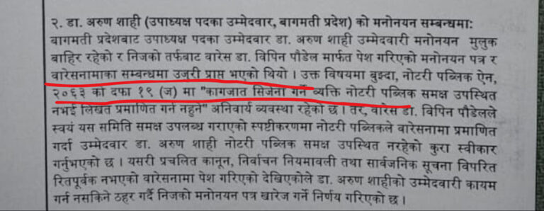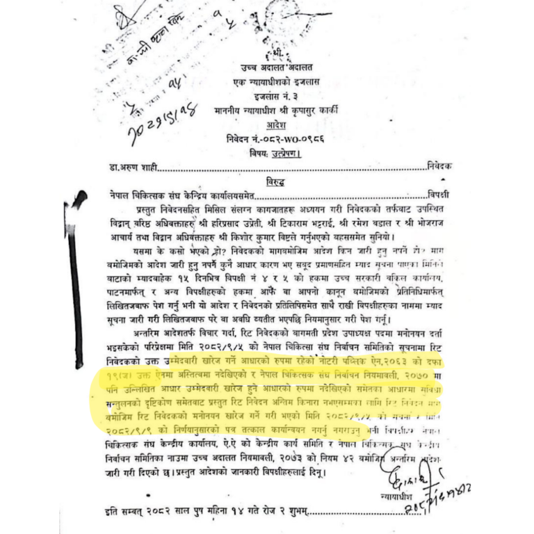 नेपाल चिकित्सक संघ बागमती प्रदेश उपाध्यक्ष पदका उम्मेदवार डा. अरुण शाहीको उम्मेदवारी खारेज गर्ने क्रममा अस्तित्वमै नभएको कानुनी व्यवस्था प्रयोग गरिएको ठहर उच्च अदालत पाटनले गरेको छ । अदालतले उम्मेदवारी खारेजीसम्बन्धी निर्णय तत्काल कार्यान्वयन नगर्न अन्तरिम आदेश जारी गरेसँगै नेपाल चिकित्सक संघको निर्वाचन प्रक्रिया, कानुनी शुद्धता र पारदर्शितामाथि गम्भीर प्रश्न उठेको छ ।