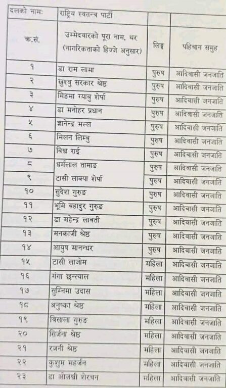 राष्ट्रिय स्वतन्त्र पार्टीले निर्वाचन आयोगमा ११० जना समानुपातिक उम्मेदवारको सूची बुझाएको छ।
