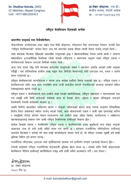 राष्ट्रिय मेलमिलाप दिवसको अवसरमा नेपाली कांग्रेसका नेता डा. शेखर कोइरालाले राष्ट्रिय एकता र मेलमिलाप आजको आवश्यकता भएको बताएका छन्। लोकतान्त्रिक आन्दोलनका नेता विपी कोइरालाले दिएको राष्ट्रिय मेलमिलापको सन्देश वर्तमान राजनीतिक परिस्थितिमा झनै सान्दर्भिक बनेको उनको भनाइ छ।