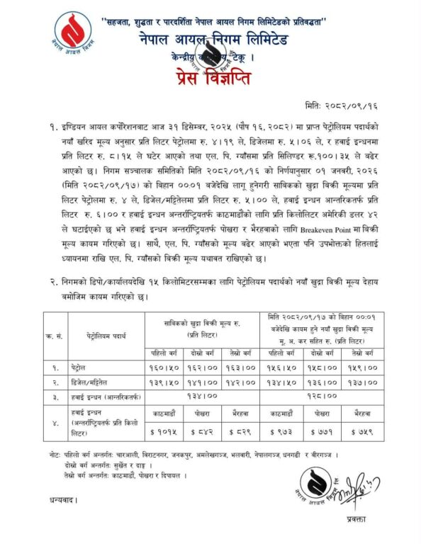 साथै, एल.पी. ग्याँसको मूल्य बढेर आएको भएता पनि उपभोक्ताको हितलाई ध्यानमा राखी एल. पी. ग्याँसको बिक्री मूल्य यथावत् राखिएको निगमले जारी गरेको विज्ञप्तिमा उल्लेख गरिएको छ ।