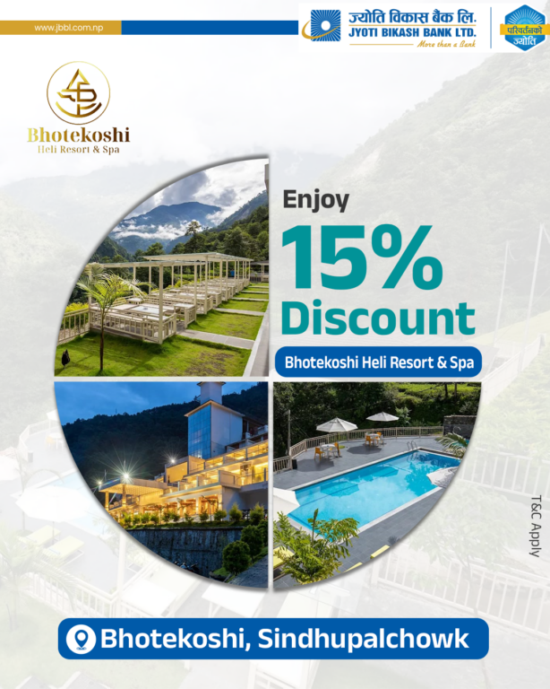 ज्योति विकास बैंक लिमिटेडले सिन्धुपाल्चोक जिल्लाको भोटेकोशीमा अवस्थित भोटेकोशी हेली रिसोर्ट तथा स्पा प्रालिसँग आफ्ना ग्राहकलाई विशेष सुविधा प्रदान गर्ने उद्देश्यले सहकार्य सम्झौता सम्पन्न गरेको छ । उक्त सम्झौतापश्चात् ज्योति विकास बैंकका ग्राहकले रिसोर्टमा उपलब्ध सेवा तथा सुविधामा १५ प्रतिशतसम्म छुट प्राप्त गर्न सक्नेछन् । भोटेकोशी क्षेत्रको मनमोहक प्राकृतिक सौन्दर्य, स्वादिष्ट परिकार तथा उत्कृष्ट आतिथ्य सेवाका कारण यो रिसोर्टले ग्राहकको मन जित्दै एक विशिष्ट पर्यटकीय गन्तव्यका रूपमा आफ्नो पहिचान स्थापित गर्न सफल भएको छ ।
