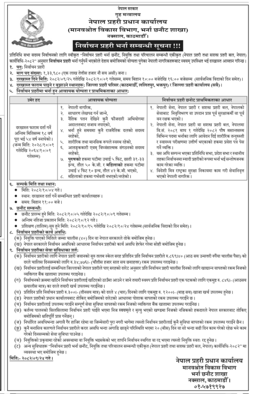 आगामी फागुन २१ गते हुने प्रतिनिधिसभा सदस्य निर्वाचनका लागि नेपाल प्रहरीले १ लाख ३३ हजार ९८० जना निर्वाचन प्रहरी भर्ना गर्न दरखास्त आह्वान गरेको छ । प्रहरी प्रधान कार्यालयका अनुसार इच्छुकले पुस २५ देखि माघ १ गतेसम्म देशभरका जिल्ला प्रहरी कार्यालय तथा काठमाडौँ उपत्यकाका प्रहरी परिसरबाट दरखास्त दिन सक्नेछन् ।