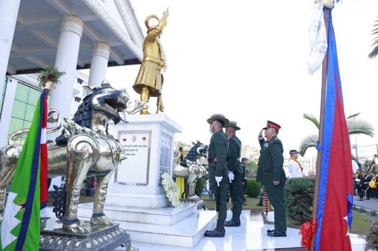आज जङ्गी अड्डामा आयोजित विशेष समारोहमा राष्ट्रनिर्माता श्री ५ बडामहाराजधिराज पृथ्वीनारायण शाहप्रति सलामी अर्पण गरिएको छ। समारोहमा प्रधान सेनापति महारथी अशोक राज सिग्देलसहित पूर्व प्रधान सेनापति, रथीवृन्द, अधिकृत तथा अन्य दर्जाले पृथ्वीनारायण शाहको सालिकमा पुष्पहार अर्पण गरेका थिए।
