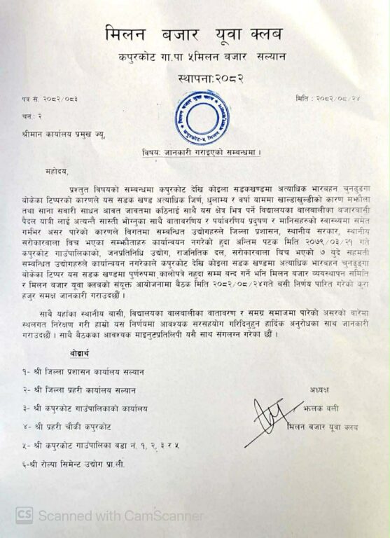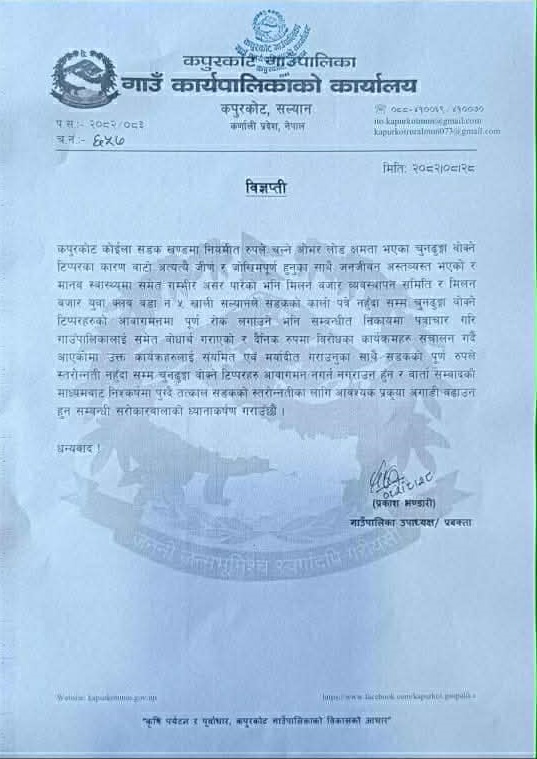 कपुरकोट गाउँपालिकाको वडा नम्बर ५ को मिलन बजार युवा क्लबको नाममा उद्योगका गाडी रोक्न उर्दी जारी गरिएको थियो| क्लबको उर्दीलाई पालिका उपाध्यक्ष भण्डारीले समस्या समाधान नगरी उद्योग बन्द गराउन उकास्ने गरेका छन्| पालिकामा बोलाएर उद्योगका कर्मचारीलाई धम्काउने र कुटपिट गर्ने कार्यले उधोगी र व्यवसायीहरु दिनप्रति दिन असुरक्षित बनिरहेका छन्|
