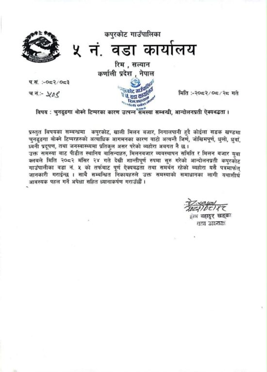 रोल्पा सिमेन्ट उद्योगले आफैले निर्माण गरेकै बाटो प्रयोग गरी चुनढुंगा पैठारी कार्य बन्द गरी क्लबको नाममा पालिकाको नेतृत्वले एक पक्षीय निर्णय गरेको छ| कपुरकोट गाउँपालिकाका उपाध्यक्ष भण्डारी र वडा नं ५ का बलाध्यक्ष होमबहादुर खड्काले २८ मंसिरमा पत्र लेख्दै आन्दोलनमा ऐक्यबद्धता जनाउनुको पछाडि रहस्य लुकेको छ|