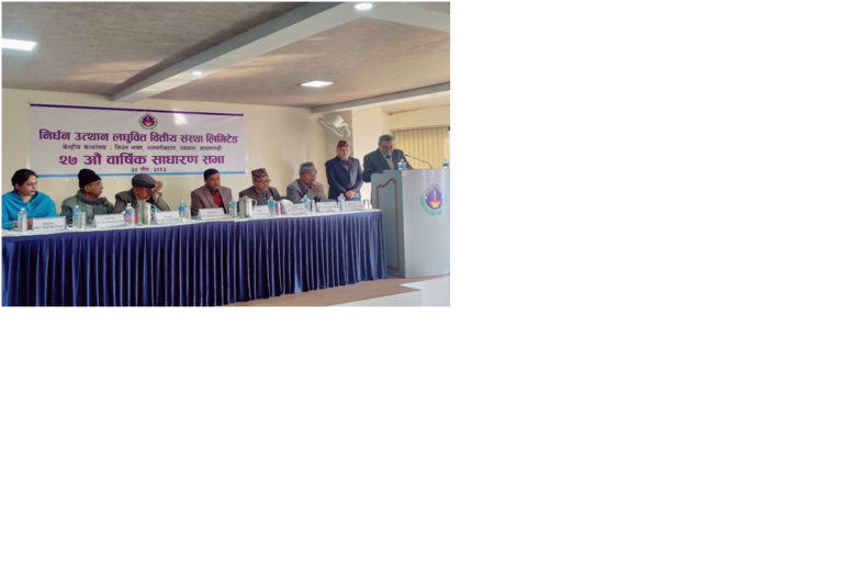निर्धन उत्थान लघुवित्त वित्तीय संस्थाको २७औँ वार्षिक साधारण सभा बुधबार काठमाडौँको नक्सालस्थित भगवतीबहालमा रहेको संस्थाको केन्द्रीय कार्यालय ‘निर्धन भवन’मा सम्पन्न भएको छ । संस्थाका अध्यक्ष जनार्दन देव पन्तको अध्यक्षतामा सम्पन्न सभामा सञ्चालक समिति पदाधिकारी, शेयरधनी, कर्मचारी, पत्रकार तथा विभिन्न संघ–संस्थाका प्रतिनिधिसहित कुल १५५ जनाको उपस्थिति रहेको थियो ।