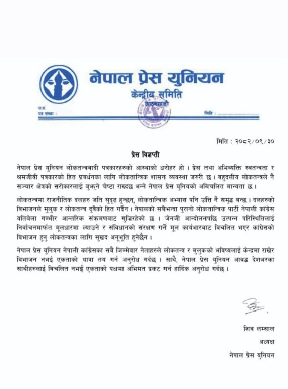 नेपाल प्रेस युनियनले नेपाली कांग्रेसका नेताहरुलाई आन्तरिक विभाजनको सट्टा एकताको यात्रा अगाडि बढाउन अनुरोध गरेको छ।