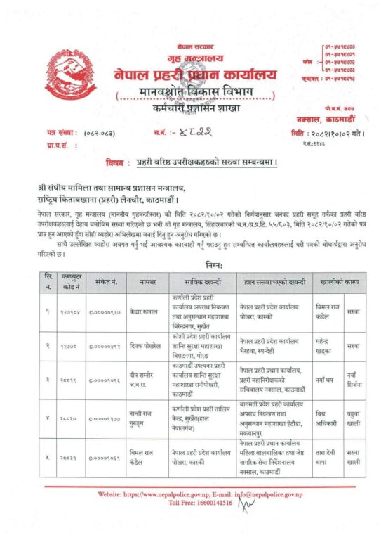 नेपाल प्रहरी प्रधान कार्यालय मानवश्रोत विकास विभागले शनिबार निर्णय गर्दै उनीहरूको सरुवा गरेको जानकारी दिएको हो।