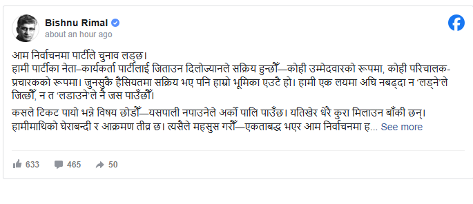 नेकपा एमालेका नेता विष्णु रिमालले पार्टीले वितरण गरेको टिकटलाई लिएर विवाद नगर्न नेता तथा कार्यकर्तालाई आग्रह गरेका छन्। सामाजिक सञ्जालमार्फत उनले आम निर्वाचन पार्टीले सामूहिक रूपमा लड्ने प्रक्रिया भएको उल्लेख गर्दै, उम्मेदवार वा प्रचारक जुनसुकै भूमिकामा भए पनि सबैको उद्देश्य पार्टीलाई जिताउनु नै भएको बताए।