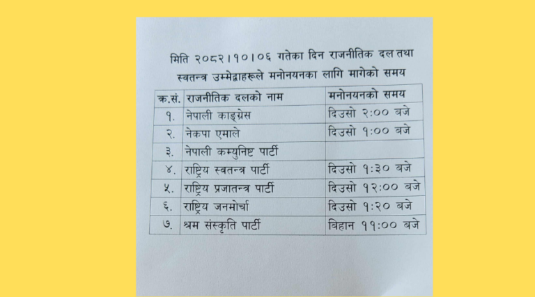 नेपाली कम्युनिष्ट पार्टी र राष्ट्रिय प्रजातन्त्र पार्टीको हकमा भने मनोनयन समय स्पष्ट रूपमा उल्लेख गरिएको छैन। सम्बन्धित निकायले तोकिएको समयअनुसार मनोनयन प्रक्रिया व्यवस्थापन गर्ने जनाएको छ।