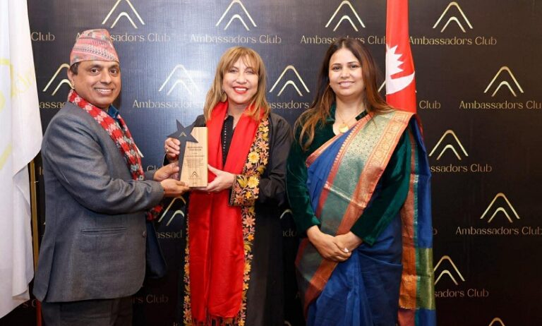 एम्बास्डर्स क्लब नेपालले संयुक्त राष्ट्रसंघीय आवासीय संयोजक–नेपाल हाना सिंगल–हाम्दीलाई विशेष समारोह बीच ‘रिक्गनिसन अवार्ड– २०२५’ द्धारा सम्मान गरेको छ ।