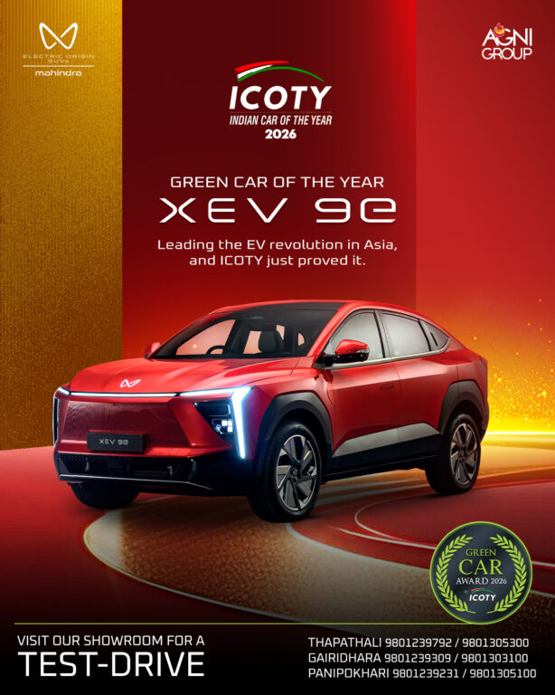 नेपालका लागि महिन्द्राको आधिकारिक वितरक अग्नि इन्कर्पोरेटेड प्रा.लि.ले अल–इलेक्ट्रिक महिन्द्रा एक्सईभी नाइन–ईलाई ‘इन्डिया कार अफ द इयर (आइकोटी) २०२६’ अन्तर्गत ग्रिन कार अवार्ड २०२६ प्रदान गरिएको हो ।