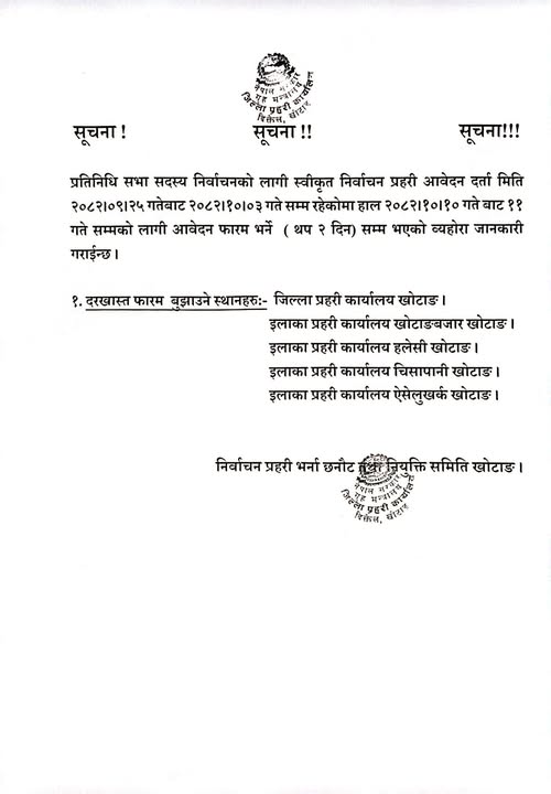 जिल्ला प्रहरी कार्यालय खोटाङले जारी गरेको सूचना अनुसार जिल्ला प्रहरी कार्यालय तथा ईलाका प्रहरी कार्यालयहरु खोटाङबजार, हलेसी, चिसापानी र ऐसेलुखर्कबाट आवेदन दर्खास्त दिन सकिने छ । प्रतिनिधिसभा सदस्य निर्वाचनका लागि जिल्लामा माग गरिएको निर्वाचन प्रहरीको आवश्यक संख्या भन्दा पनि कम दरखास्त परेपछि दर्खास्त अवधी थप गरिएको जनाईएको छ ।