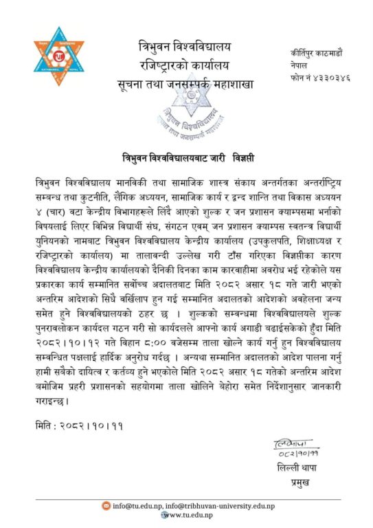 निर्धारित समयभित्र ताला नखोलिएमा सर्वोच्च अदालतको अन्तरिम आदेशअनुसार प्रहरी प्रशासनको सहयोगमा ताला खोलिने समेत त्रिविले स्पष्ट पारेको छ।
