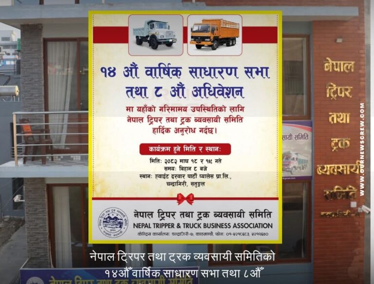 नेपाल ट्रिपर तथा ट्रक व्यवसायी समितिको १४ औँ वार्षिक साधारण सभा तथा ८ औ अधिवेशन हुने भएको छ । समितिको बैठकले वार्षिक साधारण सभा तथा निर्वाचन २०८२ साल माघ १८ र १९ गते काठमाडौंमा आयोजना गर्ने निर्णय गरेको हो । यो देशकै महत्त्वपूर्ण र ब्यवसायीक समिति हो । जसमा ४२ सय वटा सवारी साधन आबद्ध छन् । यो नेपालको दोस्रो ठुलो समिति हो ।