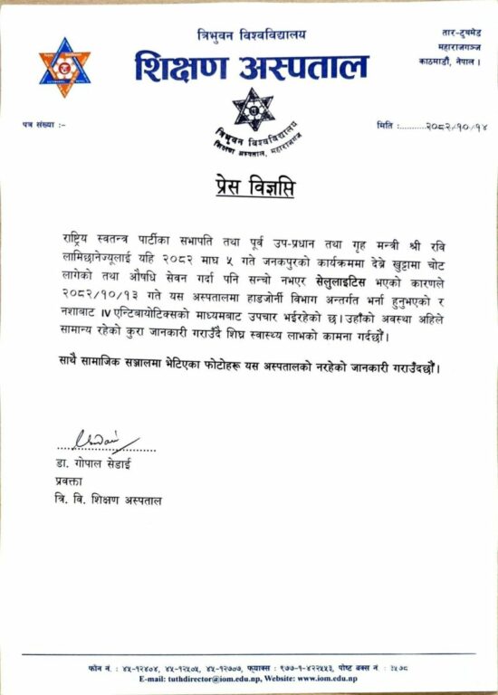 त्रिभुवन विश्वविद्यालय शिक्षण अस्पतालले बुधबार एक विज्ञप्ति जारी गर्दै रास्वपा सभापति एवं पूर्वगृहमन्त्री रवि लामिछानेको उपचार नशाबाट एन्टिबायोटिक दिई भइरहेको जानकारी दिएको हो ।