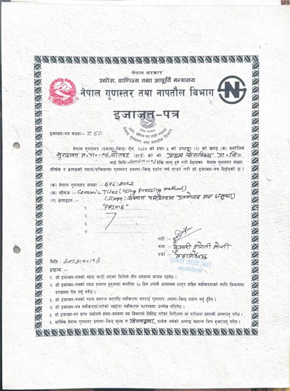 यस प्रमाणपत्रले प्राइम टायल्सका उत्पादनहरू राष्ट्रिय गुणस्तर मापदण्डअनुसार परीक्षण, प्रमाणीकरण तथा स्वीकृत भएको औपचारिक पुष्टि गरेको छ । यो उपलब्धि कम्पनीको उच्च गुणस्तर, दीर्घकालीन टिकाउपन, सुरक्षित प्रयोग तथा आकर्षक डिजाइनप्रतिको प्रतिबद्धताको स्पष्ट प्रमाण हो ।