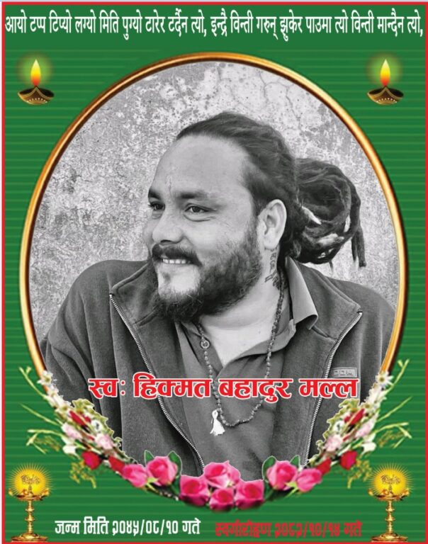स्व. हिक्मत बहादुर मल्ल मिती:२०४५साल८महिना १० गते स्व.बुवा ललित मल्ल,मुवा ललिता मल्लकाे काेखबाट बित्थडचिर गाउँपालिका वडा नं ९ खलपाटा गाउँमा जन्म भएको थियाे । बिगत लामो समय देखि कलेजाेमा समस्या का कारण उपचारार्थ अवस्थामा हुनुहुन्थ्यो । माघ १३ गते राति बिराम झनबढि भए पछि आफन्तहरूले उपचारको लागि धनगढी लिएका थिए । उपचारकैक्रममा माघ १४ गते अपराह्न धनगढी स्थित निसर्ग हस्पिटलमा निधन भएको थियाे ।