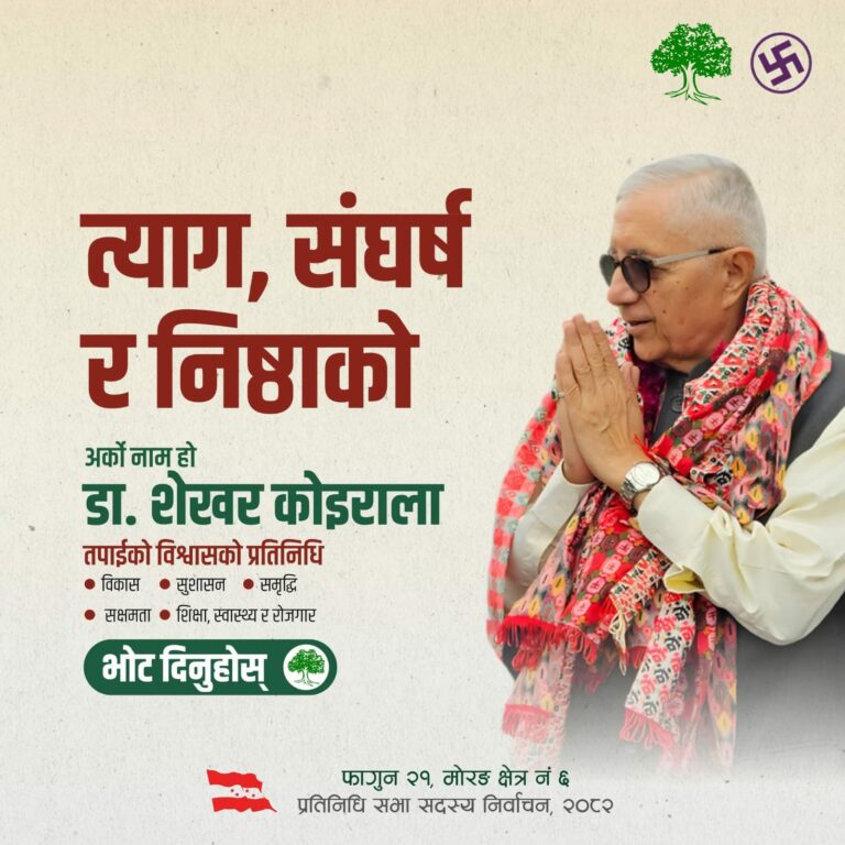 आगामी फागुन २१ गते हुने प्रतिनिधि सभा सदस्य निर्वाचन २०८२ मा लोकतन्त्र, विकास र जनमुखी शासनका लागि आफ्नो उम्मेदवारी रहेको उल्लेख गर्दै डा. शेखर कोइरालाले मोरङ–६ का सम्पूर्ण मतदातालाई आफूलाई मत दिएर समर्थन गर्न आग्रह गरेका छन्।