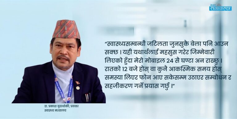 यसै सन्दर्भमा मन्त्रालयको आधिकारिक धारणा, वर्तमान अवस्था र सरकारका आगामी योजनाबारे स्पष्ट पार्न मन्त्रालयका प्रवक्ता डा. प्रकाश बुढाथोकीसँग कुराकानी गरिएको छ । विद्यालयदेखि पीएचडीसम्म सधैं प्रथम स्थान हासिल गर्दै आउनुभएका डा. बुढाथोकी पछिल्लो करिब २५ वर्षदेखि स्वास्थ्य सेवामा अनवरत योगदान पु¥याउँदै आउनुभएको छ । उहाँ एक कुशल स्वास्थ्य प्रशासकका रूपमा चिनिनुहुन्छ भने तथ्यमा आधारित सञ्चार र संकट व्यवस्थापनमा पनि दखल राख्नुहुन्छ । डा.बुढाथोकीको यो अन्तर्वार्ता केवल एक प्रवक्ताको अनुभव मात्र होइन, नेपालको सार्वजनिक स्वास्थ्य सञ्चार प्रणालीको वास्तविक चित्र हो । सूचना समयमै, सत्य र जिम्मेवारीका साथ प्रवाह गरियो भने स्वास्थ्य प्रणालीप्रति नागरिकको भरोसा बलियो बन्न सक्छ भन्ने सन्देश यस अन्तर्वार्ताले स्पष्ट पारेको छ । नेपाल समाचारपत्रका लागि भगवती तिमल्सिनाले लिनुभएको यो अन्तर्वार्ता नेपालको वर्तमान स्वास्थ्य अवस्था, संक्रामक रोग नियन्त्रणका रणनीति, स्वास्थ्य प्रणाली सुदृढीकरण र सरकारी निकायको प्रवक्ताको भूमिकामा केन्द्रित छ । प्रस्तुत छ, कुराकानीको सारसंक्षेपः