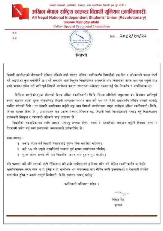 संगठनका अनुसार शुल्क शोषणविरुद्ध ३४ दिनसम्म चलेको आन्दोलन २०८२ भदौ १० गते विश्वविद्यालय प्रशासनसँग लिखित सहमति भएपछि स्थगित गरिएको थियो। तर सहमति कार्यान्वयन गर्नुको सट्टा आन्दोलनका अगुवा दिनेश ऐर, तेजप्रकाश संज्याल, शिवराज भट्ट र विक्की विष्टलाई पक्राउ गर्नु प्रशासनको दमनकारी चरित्र भएको आरोप लगाइएको छ।