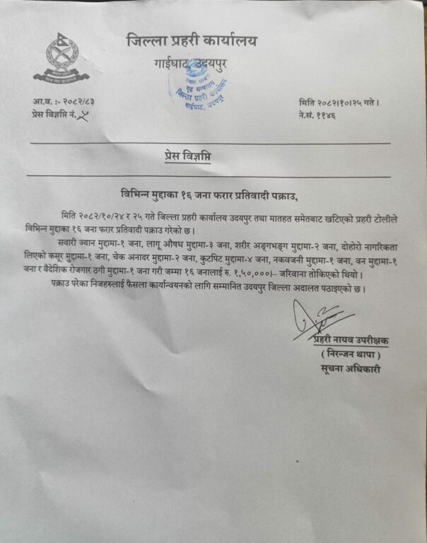 जिल्ला प्रहरी कार्यालय उदयपुर र मातहतका प्रहरी इकाई कायाृलयहरुबाट खटिएको प्रहरी टोलीले शनिबार र आइतबार गरी विभिन्न मुद्दामा दोषी ठहरिएका १६ जना फरार प्रतिवादीहरुलाई पक्राउ गरेको छ ।