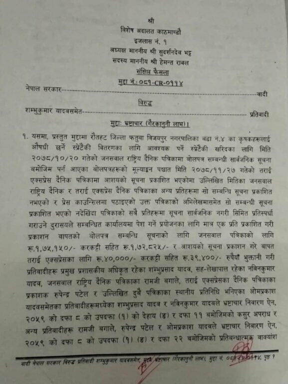 अख्तियारले २०७८ माघ २० गते जनसवाल दैनिकमा फतुवा विजयपुर नगरपालिकासँग सम्बन्धित विज्ञापन प्रकाशित गरिएको दाबी गर्दै गैरकानुनी लाभ–हानि पुर्याउने बदनियतले भ्रष्टाचार गरिएको आरोप लगाएको थियो। सोही आरोपका आधारमा जनसवाल दैनिकका अध्यक्ष/सम्पादक रामजी बगाले,जनसवाल पब्लिकेसन्स प्राली, रौतहटको फतुवा विजयपुर नगरपालिकाका तत्कालीन प्रमुख प्रशासकीय अधिकृत शम्भुकुमार यादवसहित चार व्यक्ति र दुई कम्पनीलाई प्रतिवादी बनाइएको थियो।