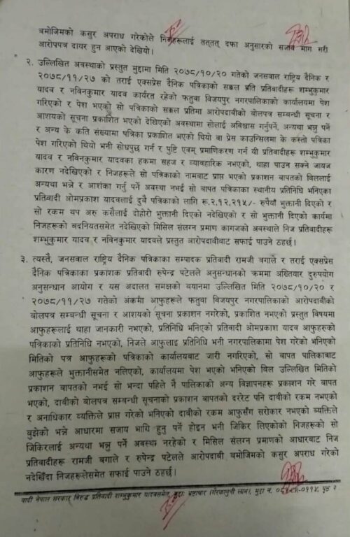 अदालतले फैसलामा जनसवाल राष्ट्रिय दैनिकका सम्पादक रामजी बगालेले अख्तियार र अदालतसमक्ष दिएको बयान, मिसिल संलग्न प्रमाण तथा कागजातहरूको विश्लेषण गर्दा आरोपदाबी बमोजिमको कसुर पुष्टि नहुने ठहर गरेको छ । अनधिकृत व्यक्तिले पत्रिकाको प्रतिनिधि भएको भनी प्रस्तुत गरेको पत्र पत्रिकाको कार्यालयबाट जारी नभएको र विज्ञापन प्रकाशन भएको पुष्टि नहुने भएकाले प्रतिवादीहरूलाई दोषी ठहर गर्न नसकिने फैसलामा उल्लेख गरिएको छ।