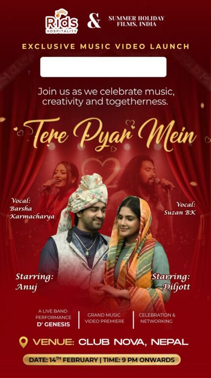 रिड्स हस्पिटालिटी र समर हलिडे फिल्म्स, इन्डिया को सहकार्यमा हुने उक्त एक्सक्लुसिभ म्युजिक भिडिओ लन्च कार्यक्रम काठमाडौंस्थित क्लब नोभा, नेपालमा राति ९ बजेदेखि सुरु हुनेछ।